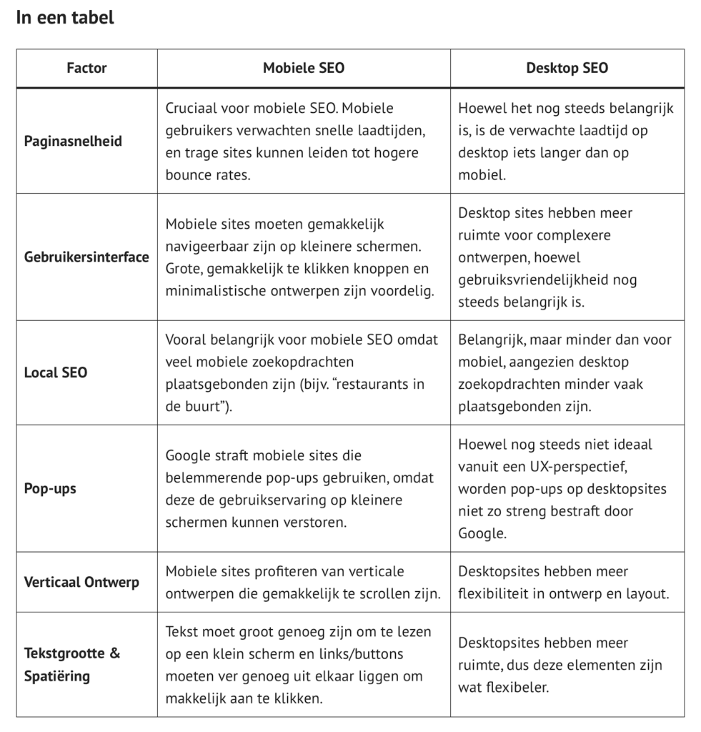 Wanneer het je nog niet helemaal duidelijk is wat precies de verschillen zijn tussen mobiele SEO en desktop SEO, helpen de onderstaande punten je dit te begrijpen.