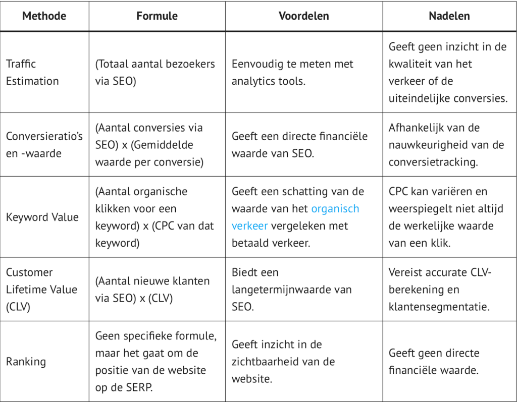 Om de waarde van onze SEO-inspanningen te berekenen, hebben we dus verschillende methoden tot onze beschikking. De onderstaande tabel geeft weer welke rekenformules we per methode gebruiken en welke voor- en nadelen hieraan zijn verbonden. Het is van belang om ons ervan bewust te zijn dat deze methoden niet altijd de volledige waarde van SEO kunnen vastleggen.