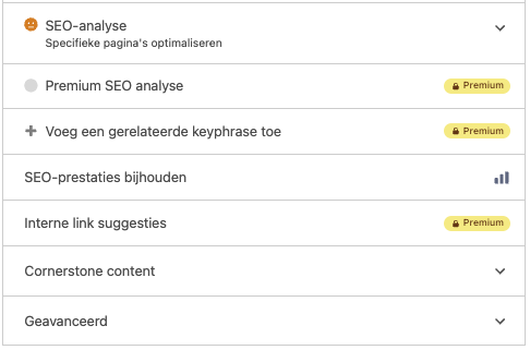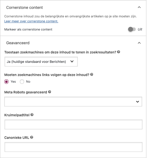 De twee aanvullende mogelijkheden binnen deze sectie zijn het markeren van cornerstone content (wat je niet verder zal helpen in Google) en geavanceerd: