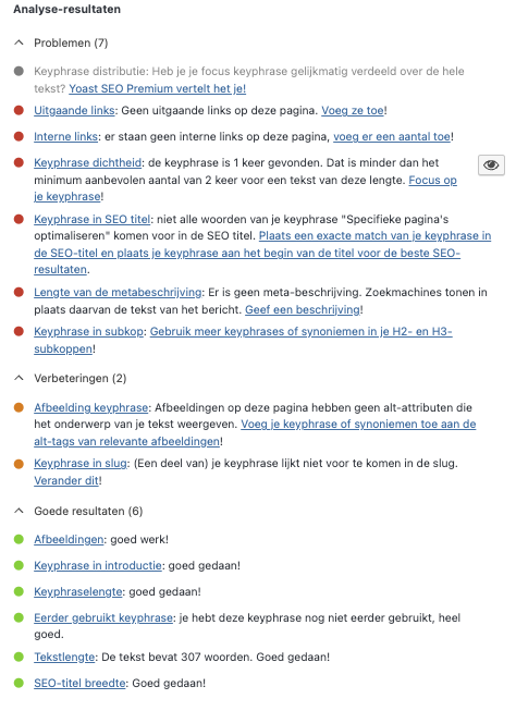 Er zijn veel verschillende zaken mogelijk in deze sectie. Voor dit artikel zullen we alleen de freemium opties bespreken (we raden niet aan om Yoast premium aan te schaffen; het is verleidelijk, maar zal waarschijnlijk niet je uiteindelijke SEO-posities verbeteren (sorry Yoast)). Zie de onderstaande screenshot voor de standaard check die Yoast op een pagina uitvoert.