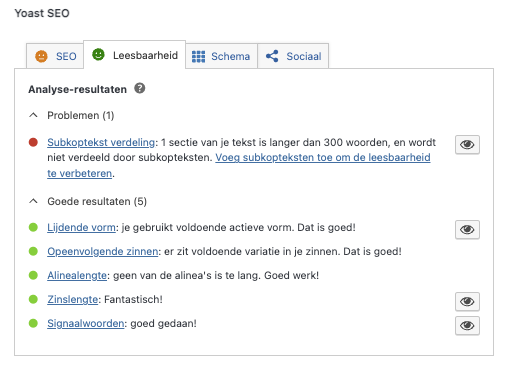 De leesbaarheid is simpelweg een standaard check van Yoast om te bepalen of een tekst goed leesbaar is voor de lezer. We vinden deze check iets beter dan de check voor SEO, omdat het hier makkelijker is om een standaard controle toe te passen op zaken als korte alinea’s, korte zinnen, actief schrijven, zinslengte en het gebruik van signaalwoorden. Zie de onderstaande screenshot voor een voorbeeld van hoe dit eruitziet.